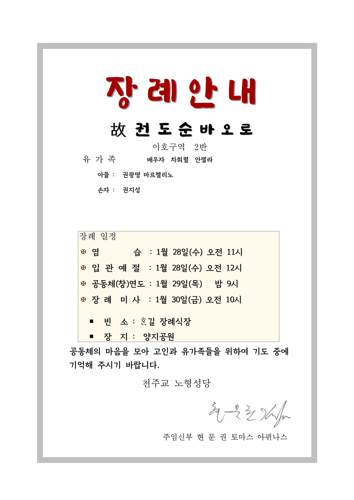 [장례]故권도순(바오로) 이호구역 2반 배우자 차희렬(안젤라)