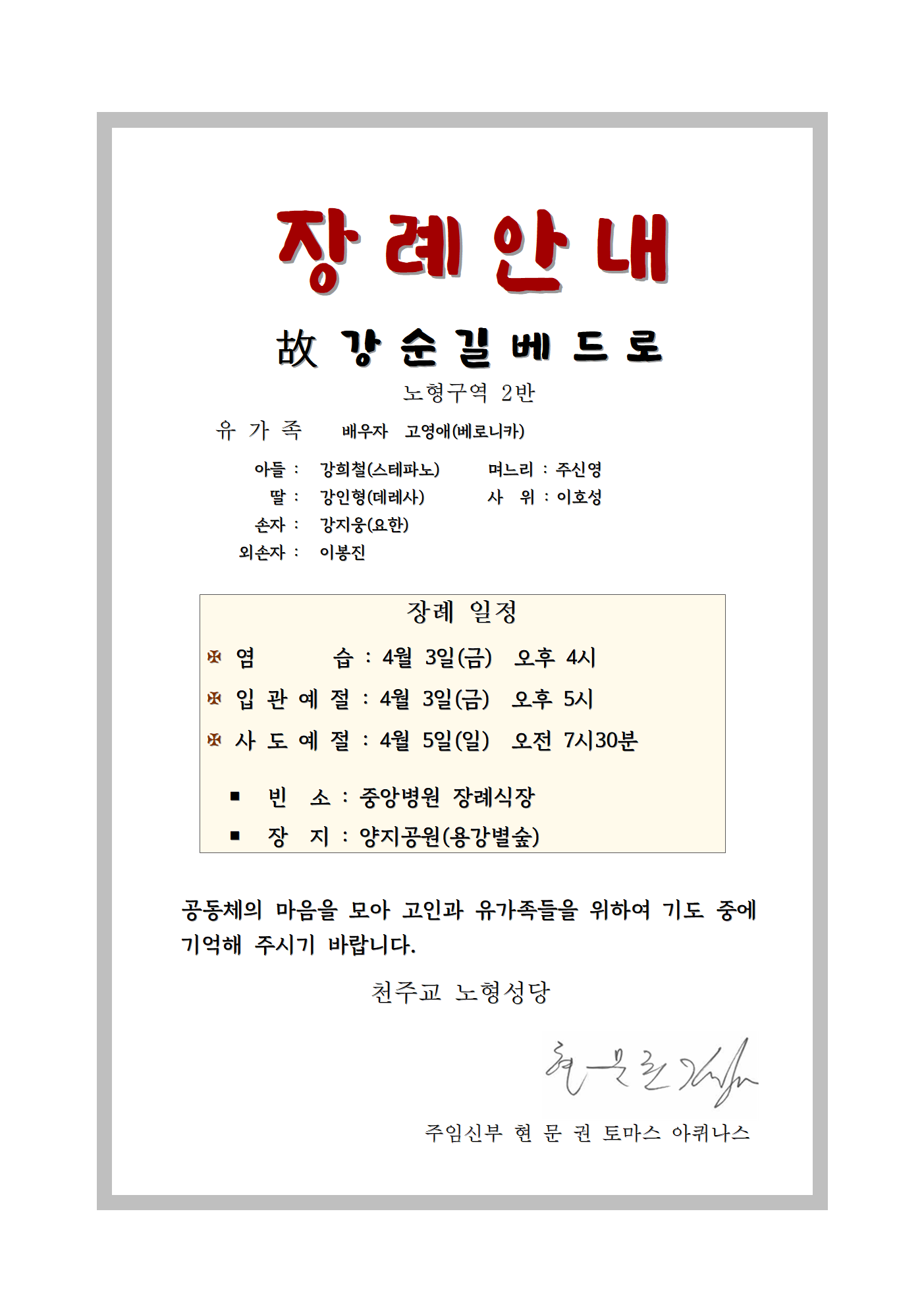 [장례]故강순길(베드로) 노형구역 2반 배우자 고영애(베로니카)