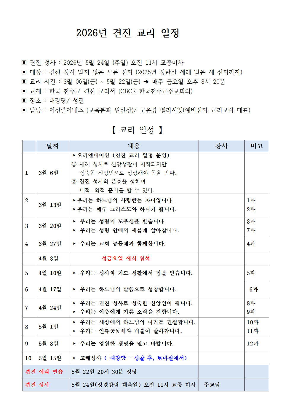 2026년 견진 교리 일정 안내