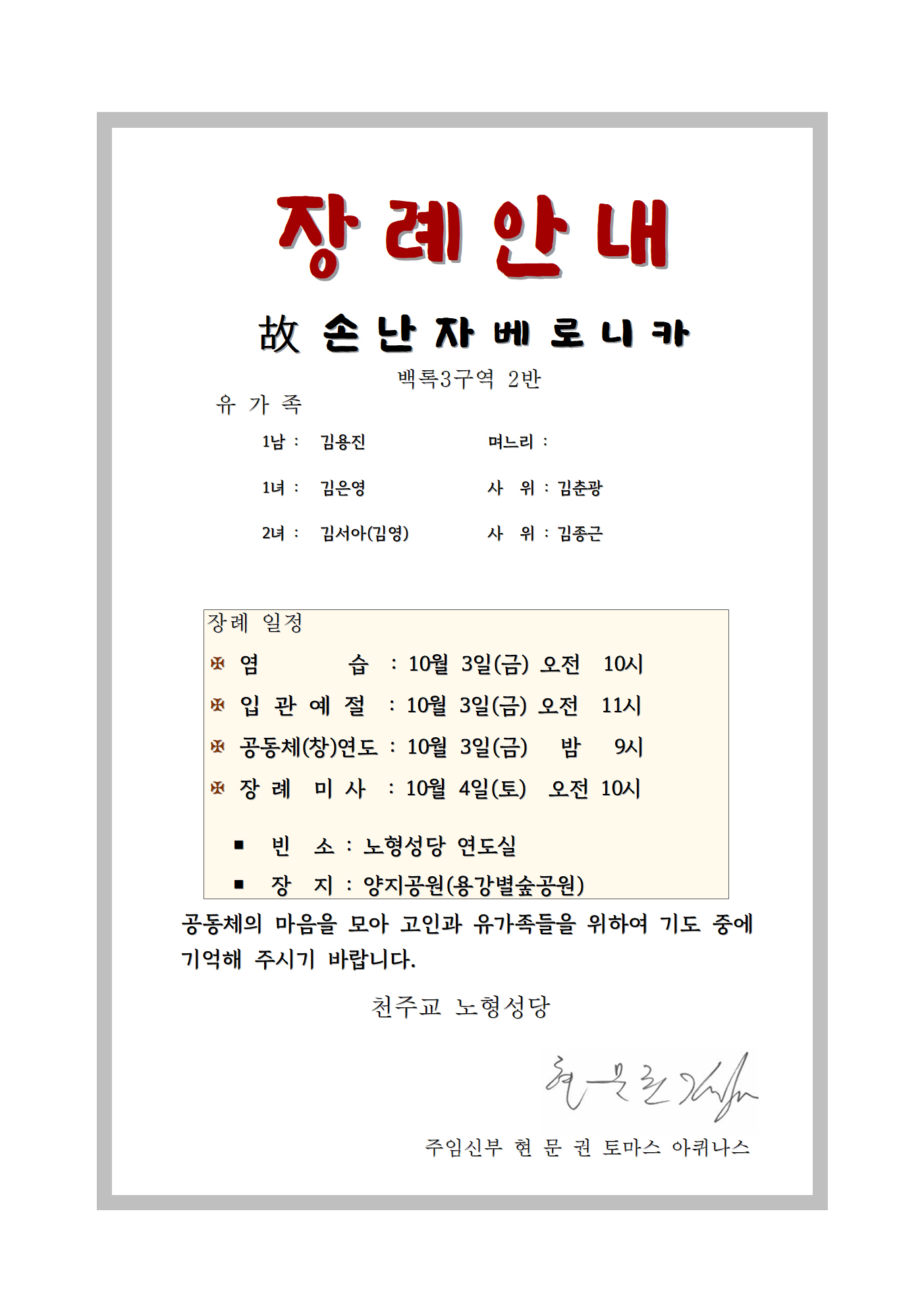 [장례]故t손난자(베로니카) 백록3구역 2반 아들 김용진